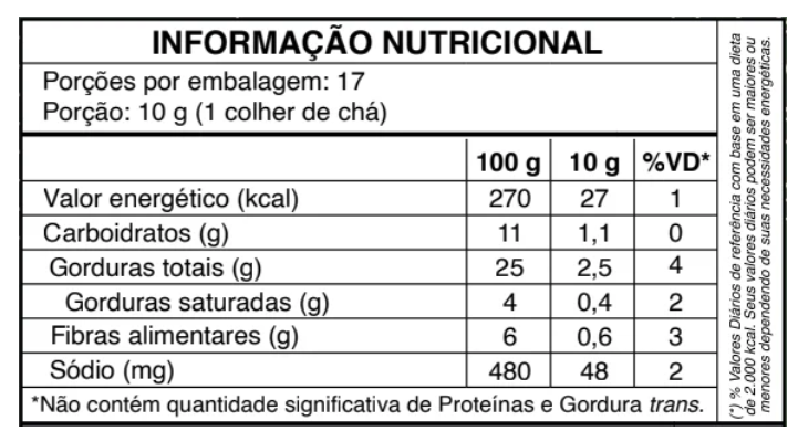 Ingredientes: Biomassa de banana verde integral, óleo de girassol, mostarda artesanal (semente de mostarda, vinagre de maçã, vinho branco, vinagre balsâmico, mel, sal, cúrcuma, canela, noz moscada), azeite de oliva, vinagre de maçã, alho desidratado, salsa, hortelã, manjericão, sal aromatizado (sal grosso, alho, alecrim, tomilho, pimenta dedo de moça, louro), alecrim, melissa e pimenta dedo de moça.
